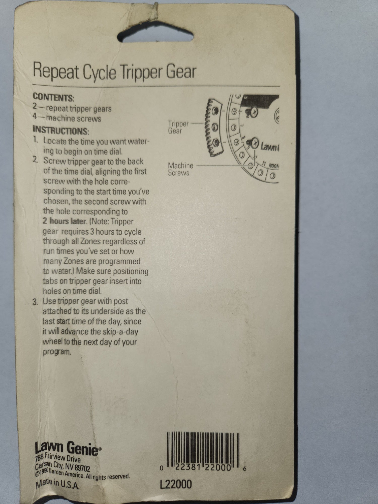 Lawn Genie and Richdel repeat cycle tripper gear for mechanical timer model: 304, 402, 404, 406, LG and PR series, and L50104P, L50106P